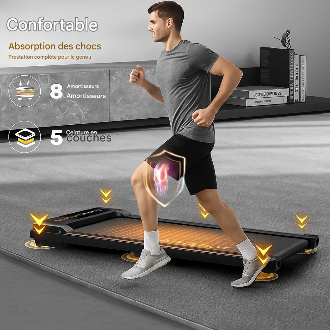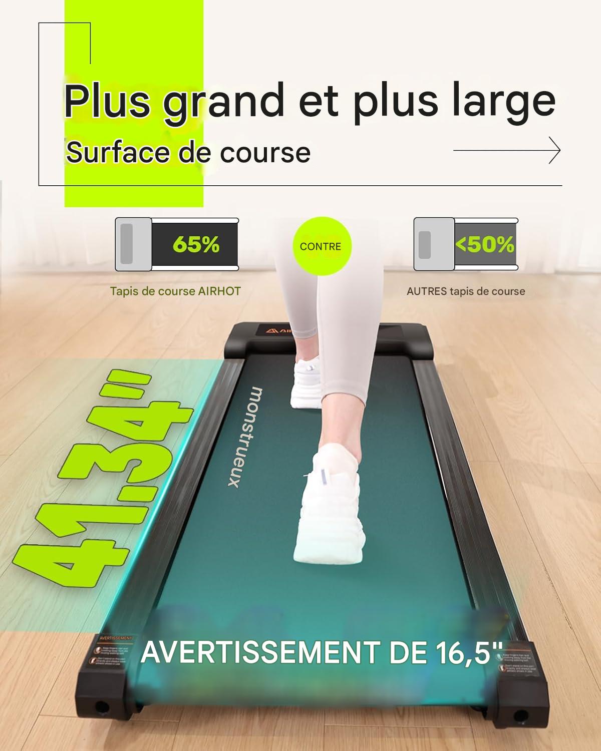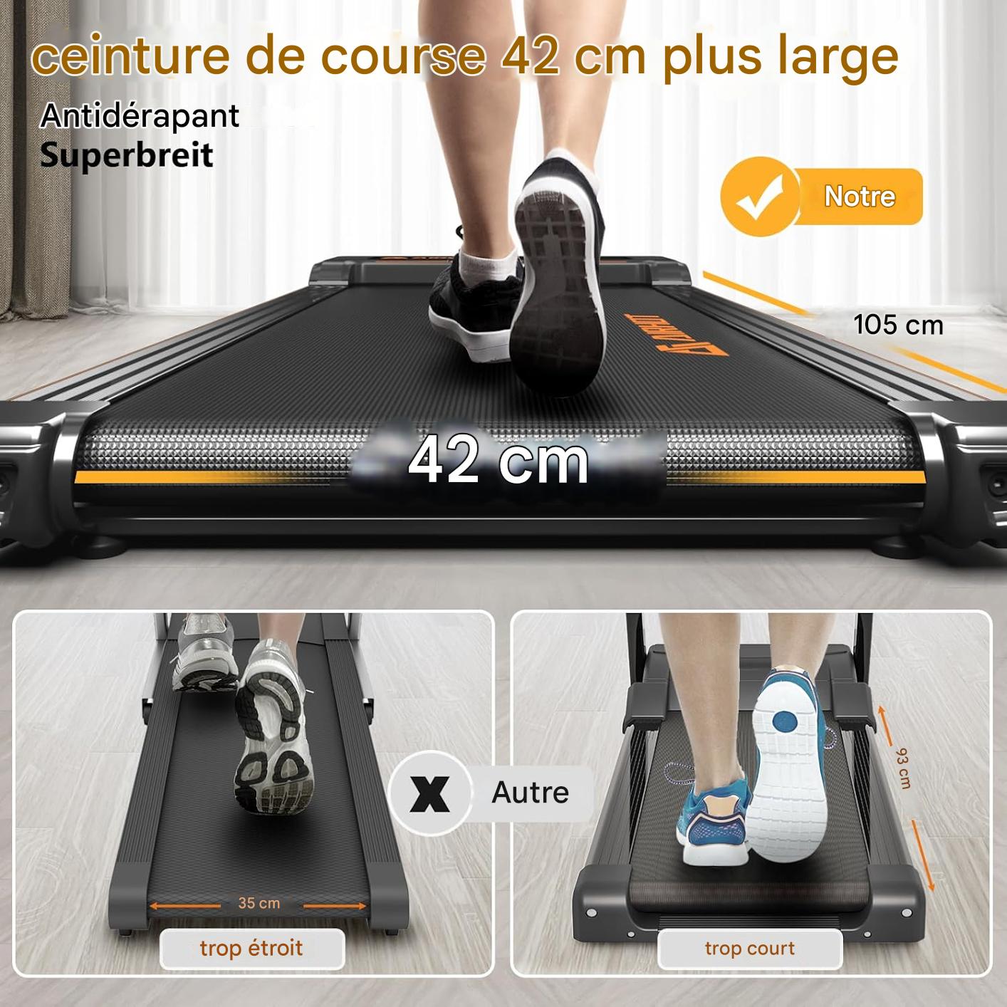 - 【Bande antidérapante à 5 couches】Profitez d'une course ou d'une marche confortable avec le tapis de course de 42 cm de large qui offre une plus grande liberté de mouvement, ainsi que la bande antidérapante à 5 couches et les supports en silicone offrent un amorti optimal pour vos genoux, muscles et articulations.