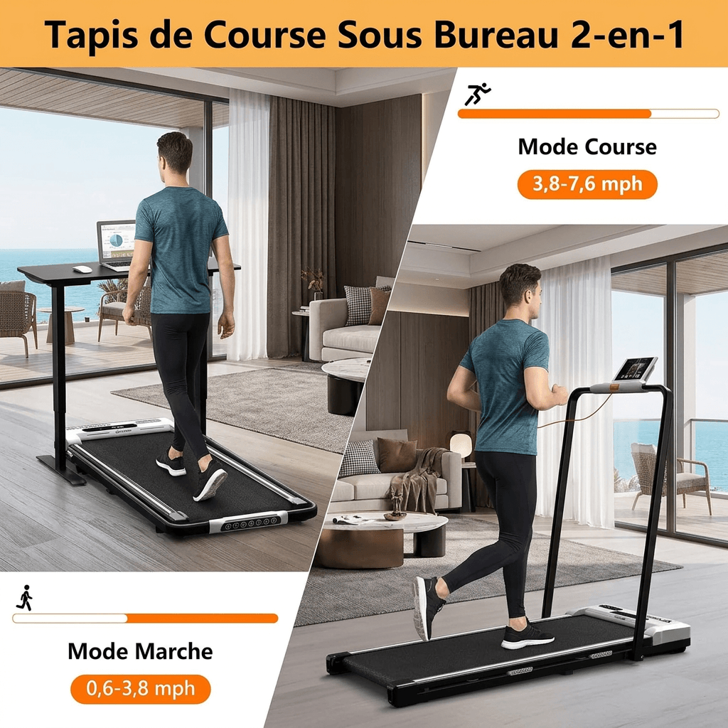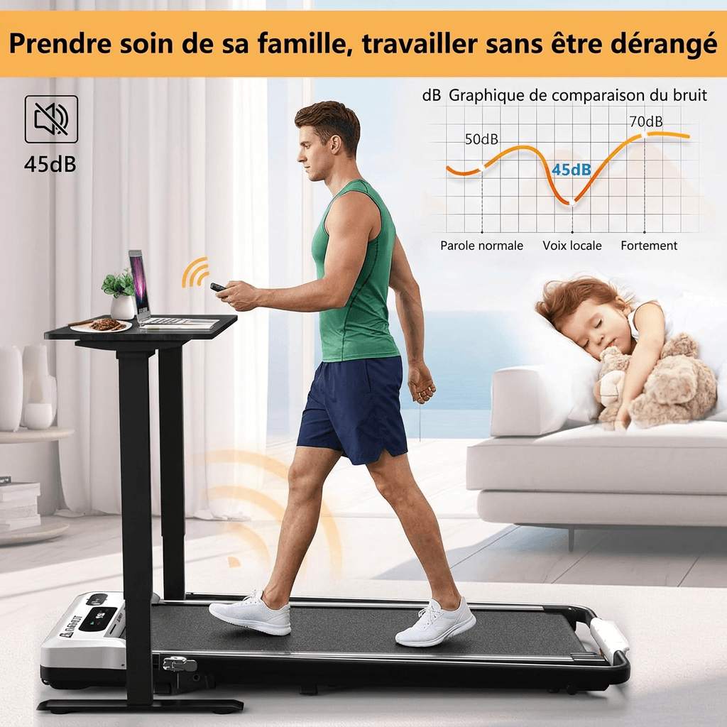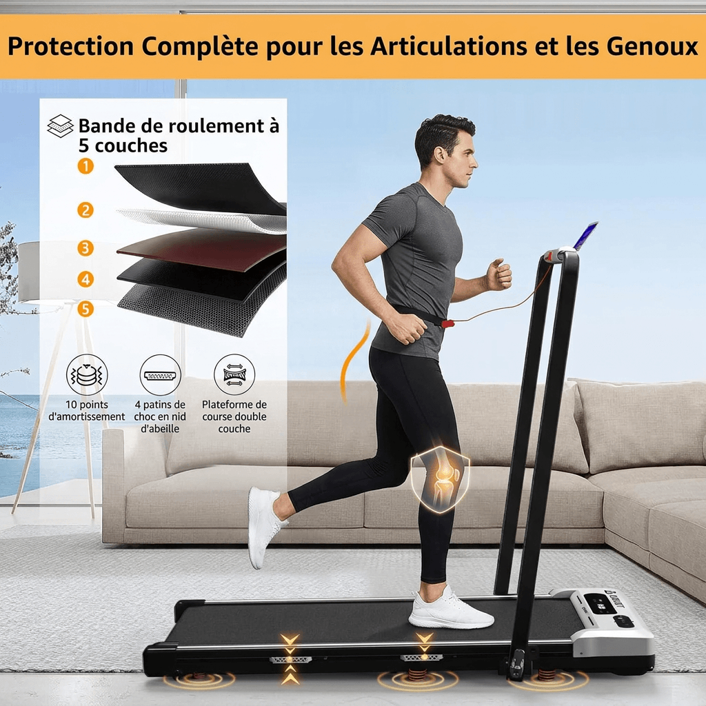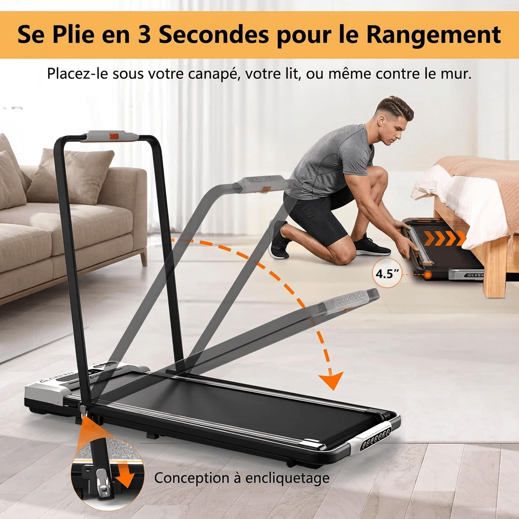 Le mode pliable 2-en-1 permet aussi bien le jogging/la course rapide que la marche sous un bureau lorsque les accoudoirs sont abaissés. Idéal pour rester actif même pendant les heures de travail et répondre aux besoins de toute la famille.