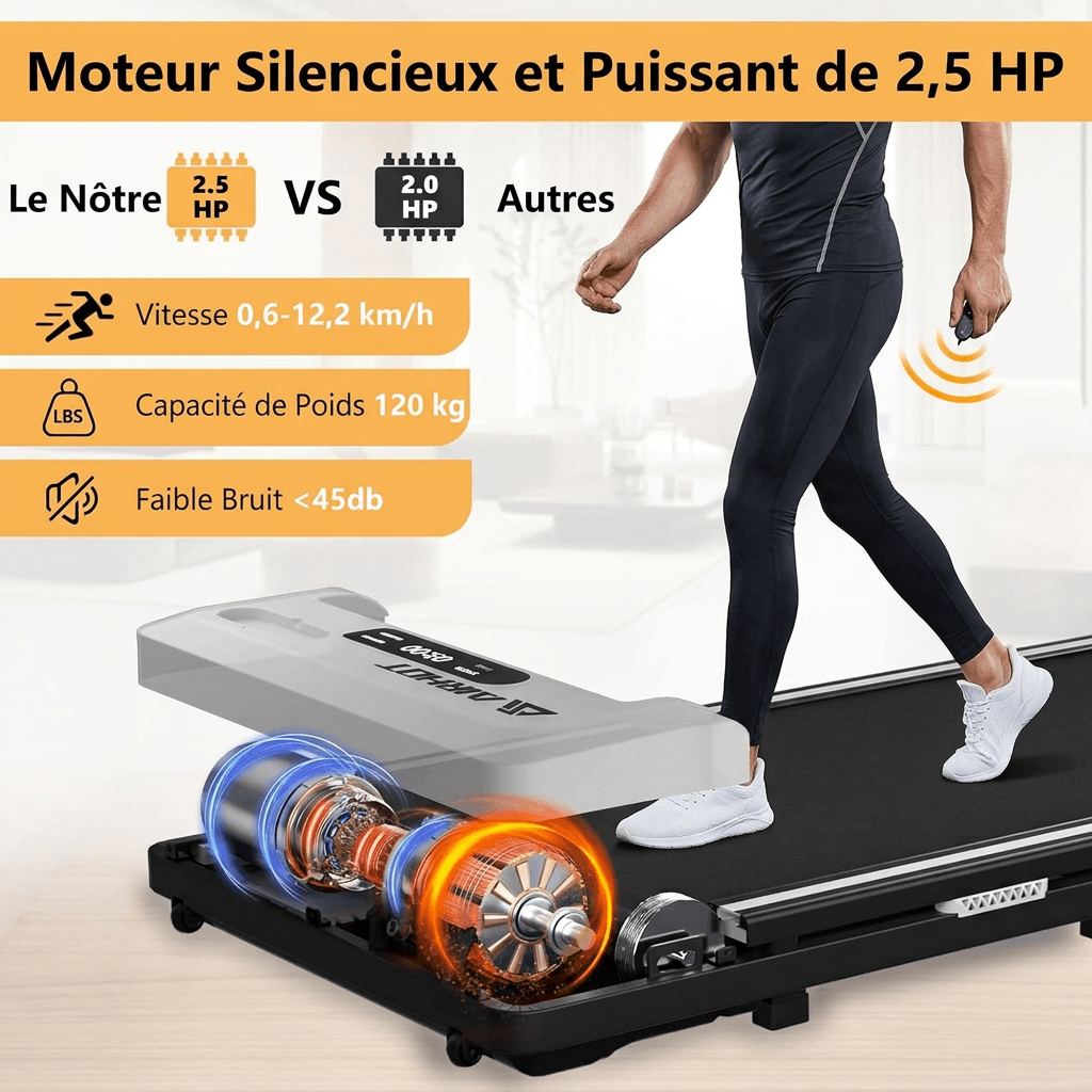 Le moteur de 2,25 HP offre une vitesse de 0,6 à 6,2 mph et assure un fonctionnement stable avec une capacité de charge allant jusqu’à 120 kg. Le moteur est silencieux et ne dérange pas les autres.