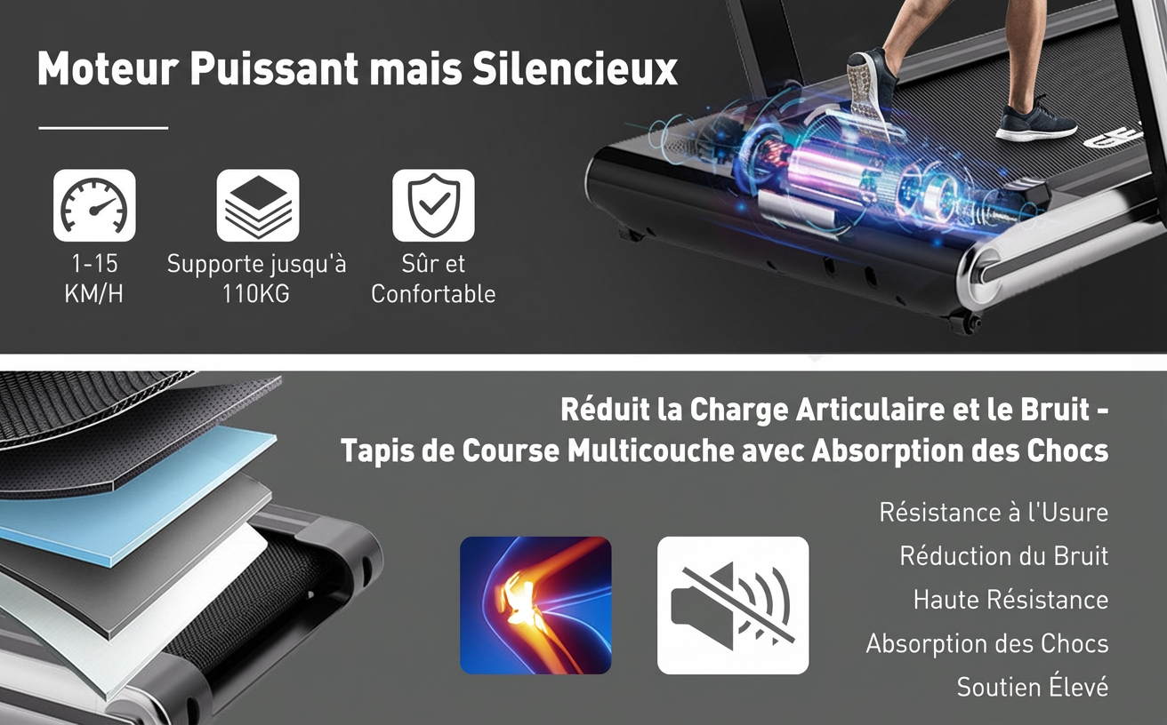 【Bande de course élargie et système d’amorti absorbant les chocs】
