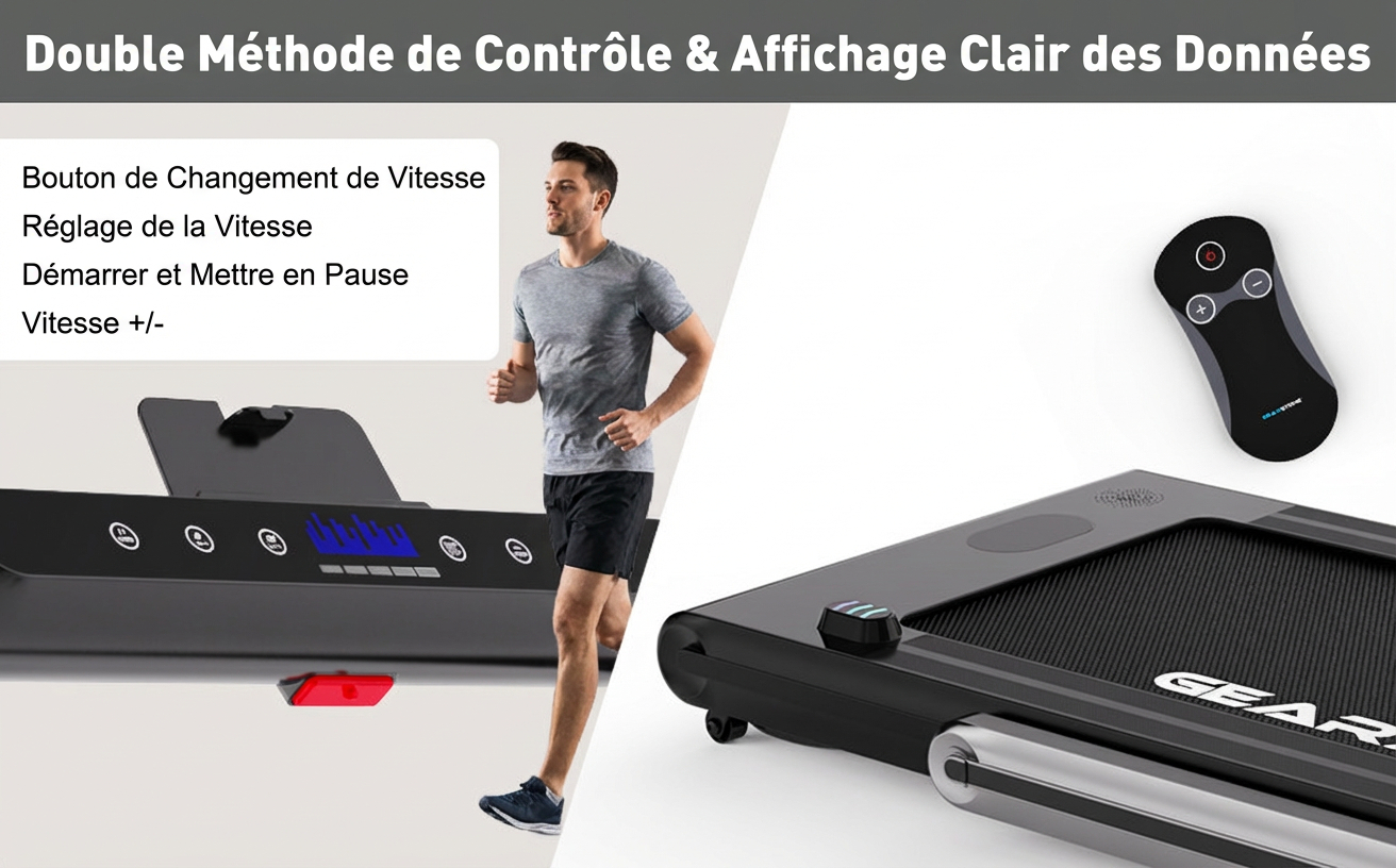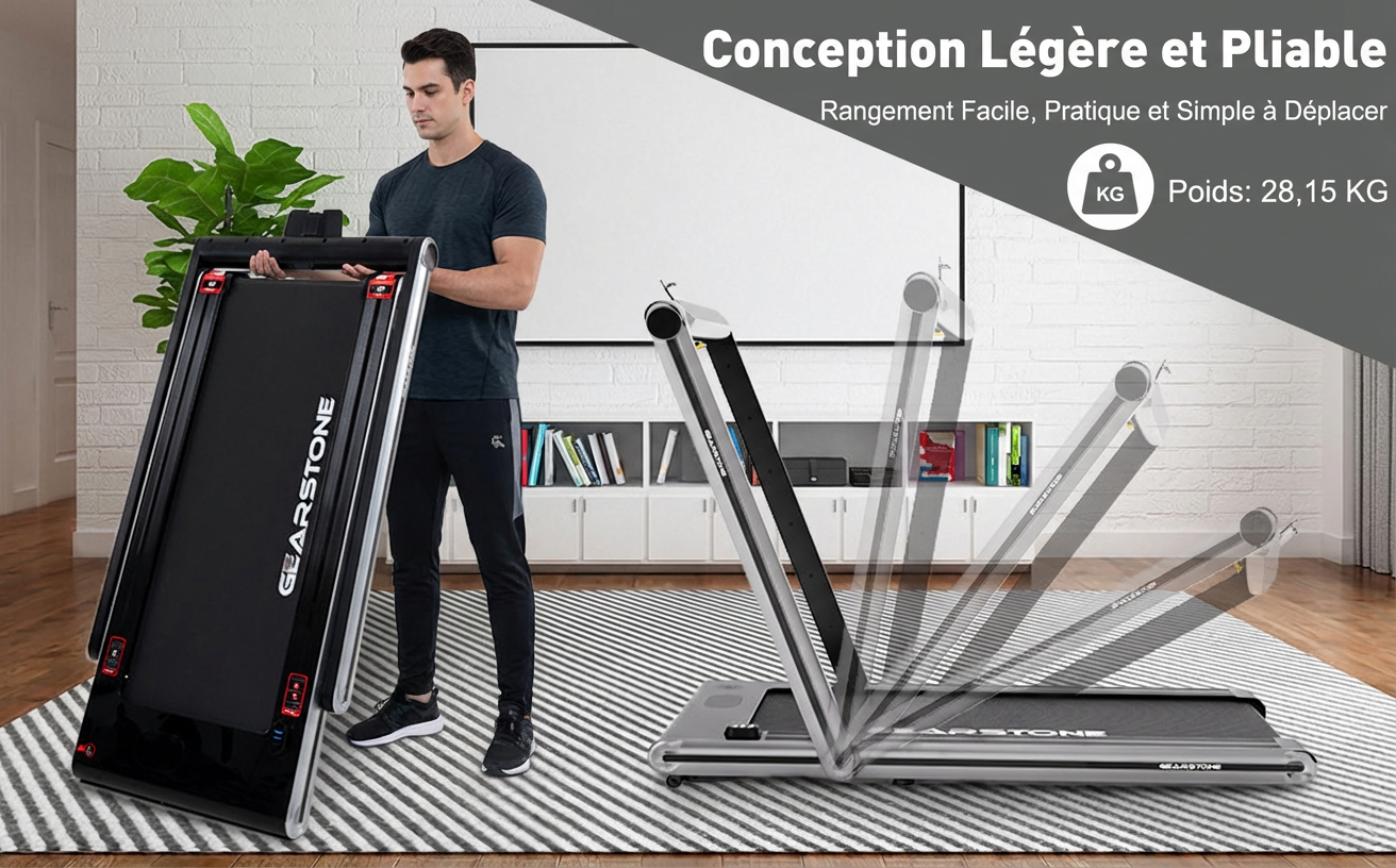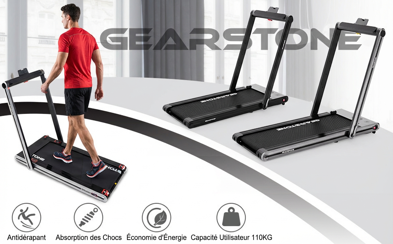 Le tapis de course pliable 2 en 1 GEARSTONE dispose de deux modes d’entraînement. Il peut être utilisé comme tapis de course classique ou comme tapis de marche sous bureau. Lorsque le cadre vertical est déplié, il offre une plage de vitesse de 1 à 15 km/h. Vous pouvez marcher, faire du jogging ou courir à la vitesse souhaitée. Lorsque le cadre vertical est plié, il fonctionne comme tapis de marche sous bureau avec une plage de vitesse de 1 à 4 km/h, vous permettant de marcher tout en travaillant et de profiter de votre activité physique quotidienne.