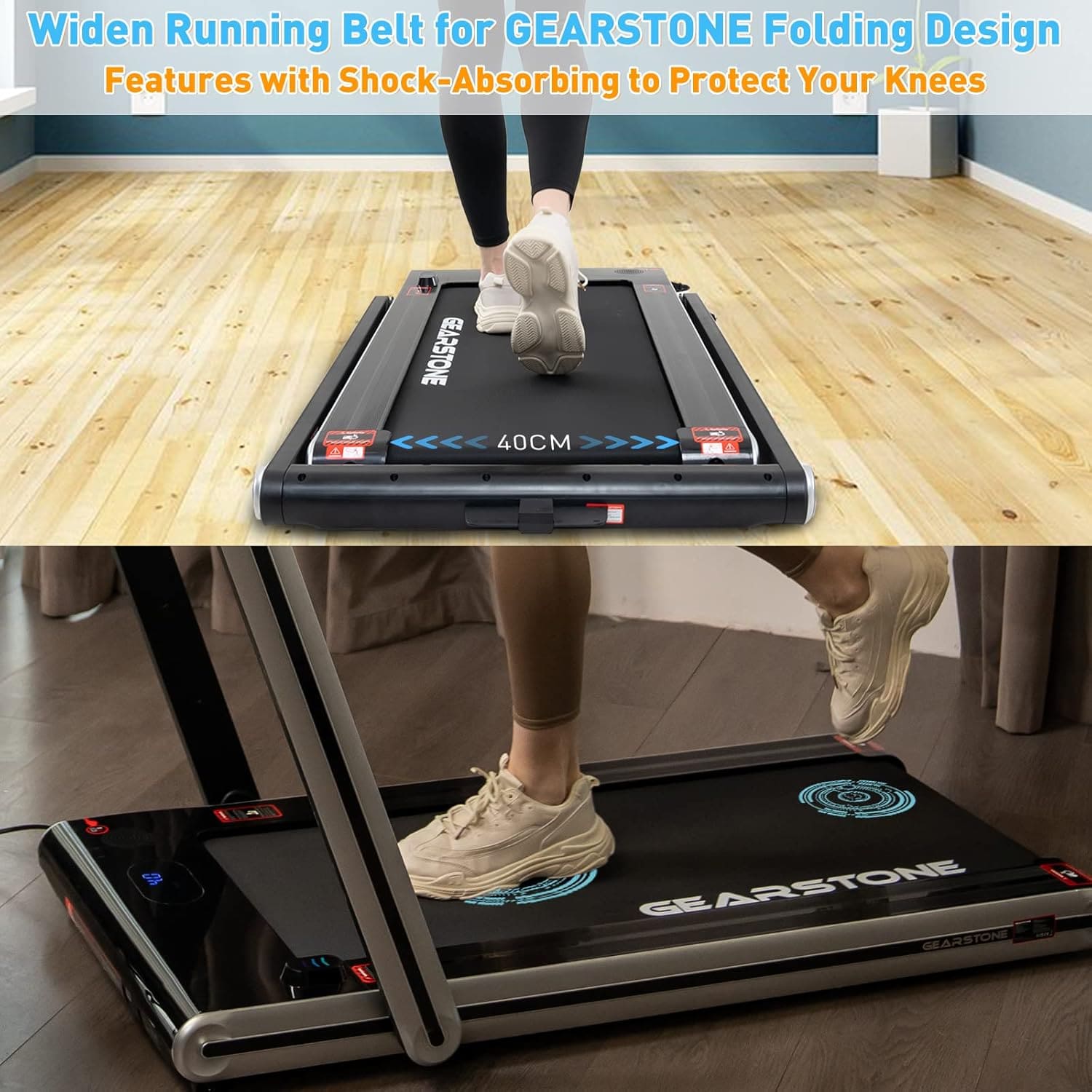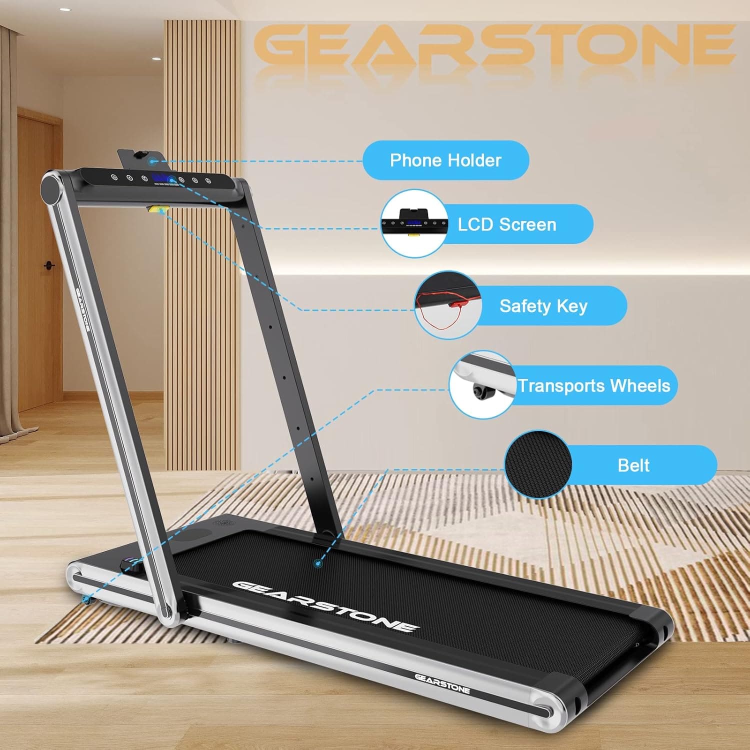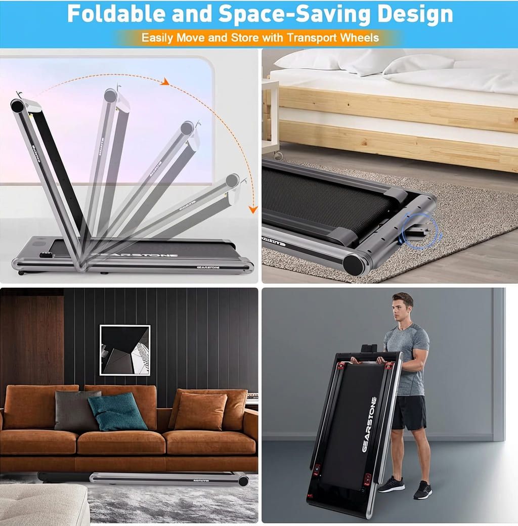 Le tapis de course pliable 2 en 1 GEARSTONE dispose de deux modes d’entraînement. Il peut être utilisé comme tapis de course classique ou comme tapis de marche sous bureau. Lorsque le cadre vertical est déplié, il offre une plage de vitesse de 1 à 15 km/h. Vous pouvez marcher, faire du jogging ou courir à la vitesse souhaitée. Lorsque le cadre vertical est plié, il fonctionne comme tapis de marche sous bureau avec une plage de vitesse de 1 à 4 km/h, vous permettant de marcher tout en travaillant et de profiter de votre activité physique quotidienne.