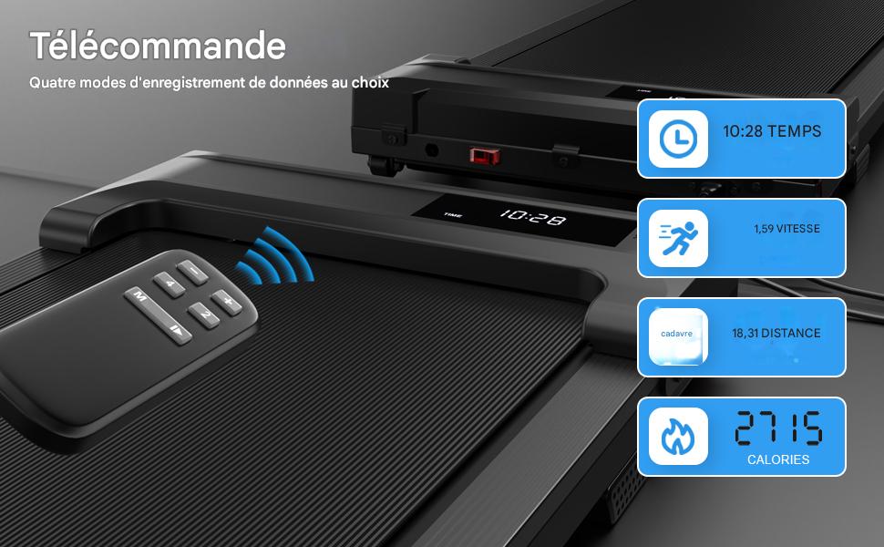 Le walking pad affiche en temps réel le temps ⏱️, la vitesse ⚡, les calories brûlées 🔥 et la distance 📏. Vous pouvez ajuster la vitesse et mettre en pause facilement grâce à la télécommande 🎮. Une utilisation régulière peut contribuer à améliorer la condition physique 💪.
