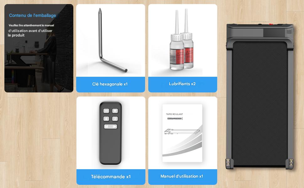 Le produit comprend une télécommande 🎮, de l’huile de lubrification 🛢️, une clé hexagonale 🔧 et un manuel d’utilisation 📘.