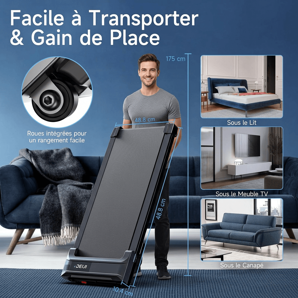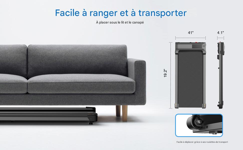 Conçu pour être facile à transporter 🚚 et à ranger, ce walking pad ne nécessite aucun montage. Il est équipé de roues et peut être glissé sous un canapé 🛋️, un lit 🛏️ ou un bureau pour une utilisation pratique, même en travaillant.